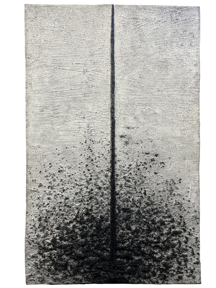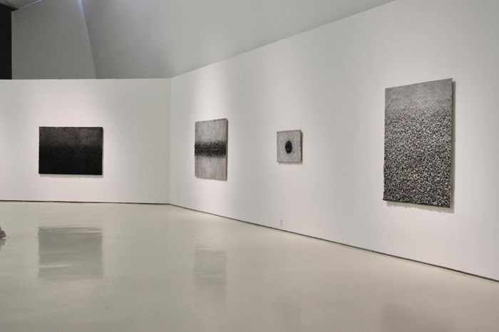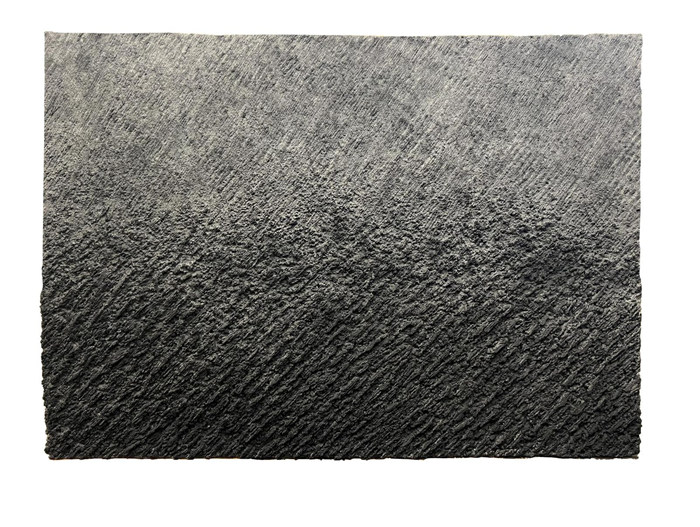 隨著時(shí)間的推移,韓紙和木炭逐漸變得厚重并完全融合,最終形成至少10層,有時(shí)多達(dá)20至30層的融合層,在表面上創(chuàng)造了粗糙而陡峭的浮雕,指涉出可能存在的內(nèi)在景觀,在其上光影可能呈現(xiàn)出無(wú)限變化的色調(diào)和效果。李鎮(zhèn)雨的作品通過(guò)痕跡和擦除同樣喚起了空虛和存在的感覺(jué),其寧?kù)o的構(gòu)圖植根于純粹的形式和煉金術(shù)的精神。