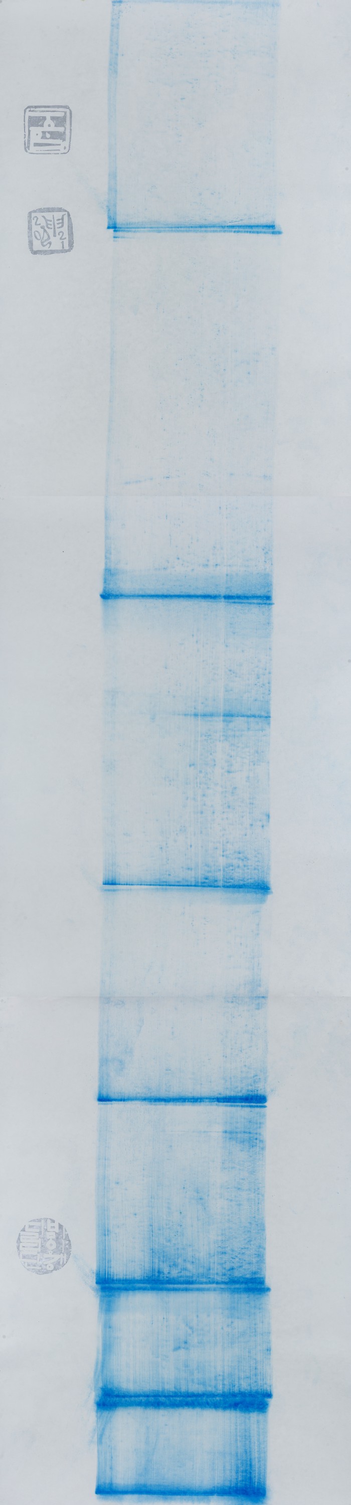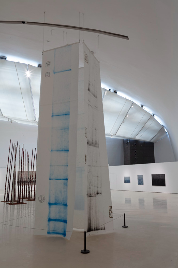在這次展覽中,李鎮(zhèn)雨展出了超過(guò) 16件主要作品,如《長(zhǎng)河》及其隨后的繪畫(huà)《瀑布》《雨》《河流》等,他的作品將長(zhǎng)江視為中國(guó)大陸的生命線,表達(dá)了對(duì)復(fù)興和活力的祈禱。這些作品的靈感來(lái)自于他2008年在中國(guó)七個(gè)月的旅行。李鎮(zhèn)雨將水描述為更新、凈化和再生的象征,《瀑布》《雨》《河》和《藍(lán)》系列作品都以中國(guó)的復(fù)興和繁榮為中心。