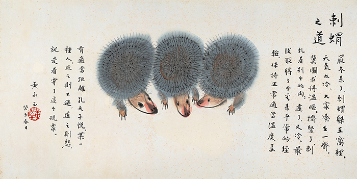 刺猬之道 黃永玉 紙本水墨設(shè)色 134.5cm×67.5cm 2003年(圖片來源:清華大學(xué)藝術(shù)博物館)