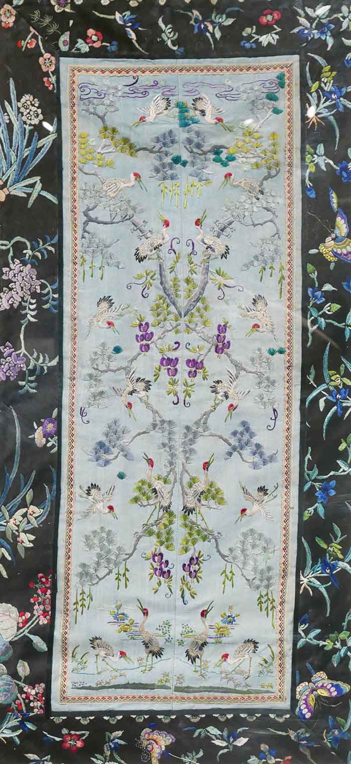湖藍(lán)緞地平針銹鶴壽松齡紋挽袖繡片 63.5cm×30.5cm 清
