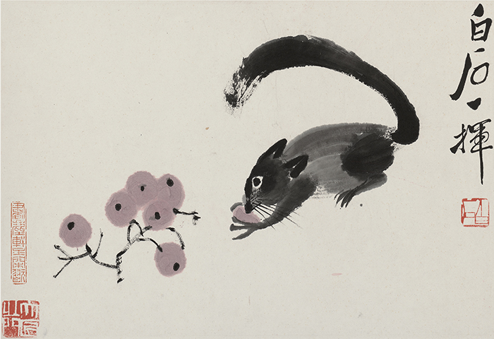 松鼠葡萄 齊白石 紙本水墨設(shè)色 27.4cm×40cm 現(xiàn)代(圖片來源:清華大學(xué)藝術(shù)博物館)
