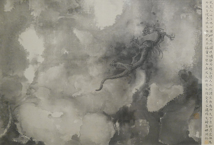 “海天麟爪”聚焦神獸,繪畫、雕塑、陶瓷、織繡等成組展品綜合呈現(xiàn)了龍、鳳、仙鶴的象征意味以及圖騰屬性。大尺幅的織繡展品在呈現(xiàn)不同的吉祥紋樣之余,同時(shí)揭示了代表性動(dòng)物意象在織繡中與“色制”的密切關(guān)聯(lián),譬如比金黃更高階、一度成為“禁色”的紫色,這也體現(xiàn)出相關(guān)意象的局限性與克制性。“路修遠(yuǎn)以周流”,當(dāng)代藝術(shù)家以“昆侖”以及“云游”為線索的創(chuàng)作成為“海天麟爪”的點(diǎn)睛之筆:潛龍勿用,幻化成空;深藏若拙,臨機(jī)取決。