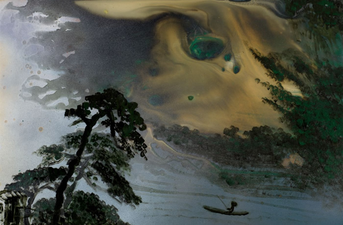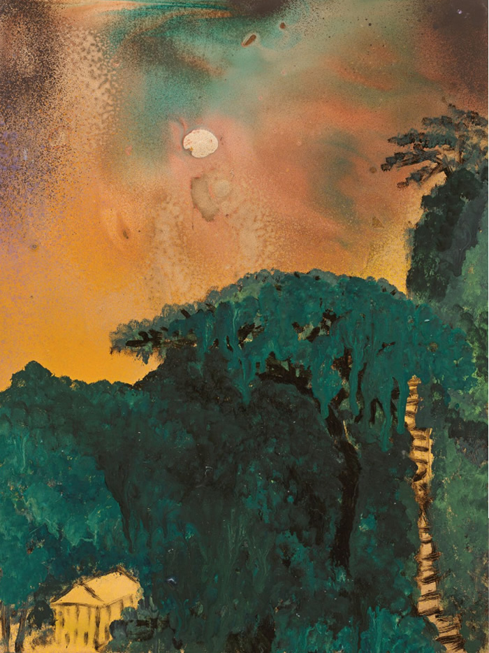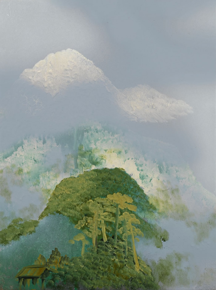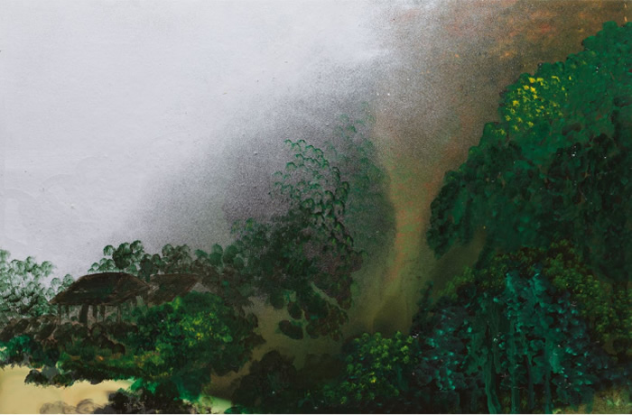 顯然,溫驤的第二批漆畫創(chuàng)作已經(jīng)脫去了更多的筆墨痕跡,它們既不同于傳統(tǒng)山水,引入的光與色也未與西方的風景畫產(chǎn)生多大的關聯(lián)。山巒、房屋、草木多逸筆草草,天際江河尋不到任何重力的牽引。