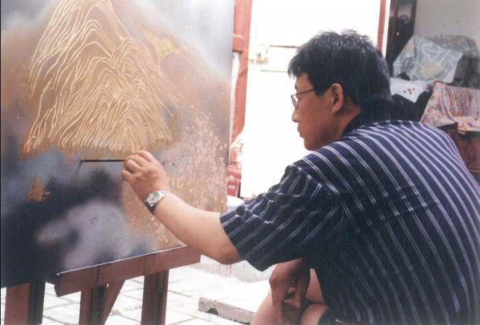 創(chuàng)作漆畫時的溫驤 拍攝于 2000 年