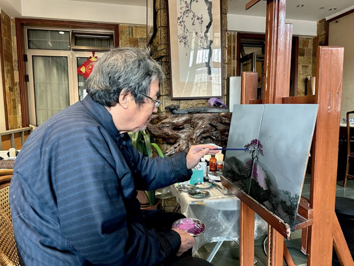 創(chuàng)作漆畫時的溫驤 拍攝于 2023 年
