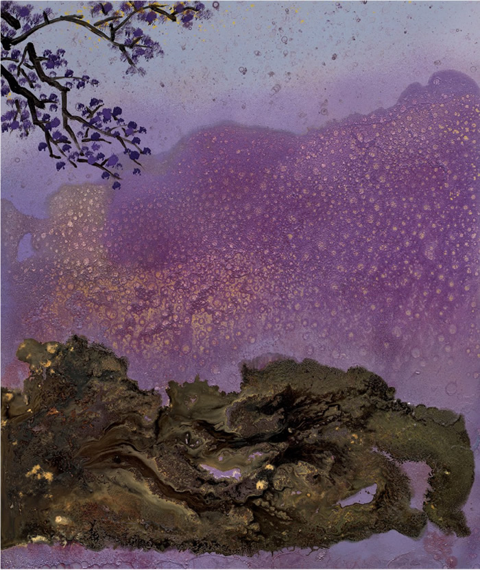 比如2023年完成的《山中月夜的靈光》,前景是幽綠的山林,夜空充溢著橘黃色的月光,伴以游移的綠色微光,如極光掠過天際?!睹倒屐F中的晨曦》和《桃花源》的典型山水圖示中使用大片連綿的粉色暗示桃花盛開,浪漫而迷人;《塵?!分械目輼淅衔莸囊庀蟊活^頂盤旋的黑塵所打破;在《春山河谷有漁人》中前景中是沉靜的蒼松和漁人,天空則升騰起漩渦狀的黃色霧靄,天地間已風雨欲來。