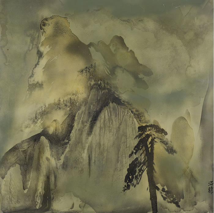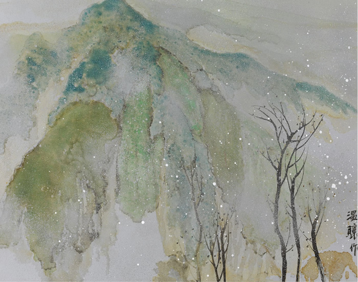 溫驤受日本畫影響,對用色很有講究。傳統(tǒng)水墨山水對色彩多有排斥,但溫驤并不受這些規(guī)矩所束縛,最初的漆畫中用色內(nèi)斂,藝術家會利用灰色、淡赭等底料色彩形成畫面基調(diào),在素墨中摻以土黃、綠表現(xiàn)山體,云霧雪光也非純白,而是銀灰、灰藍或煙黃。水天草木著了色,便有了四季雨雪陰晴的變化,山水就有了靈動和瞬間的感受。