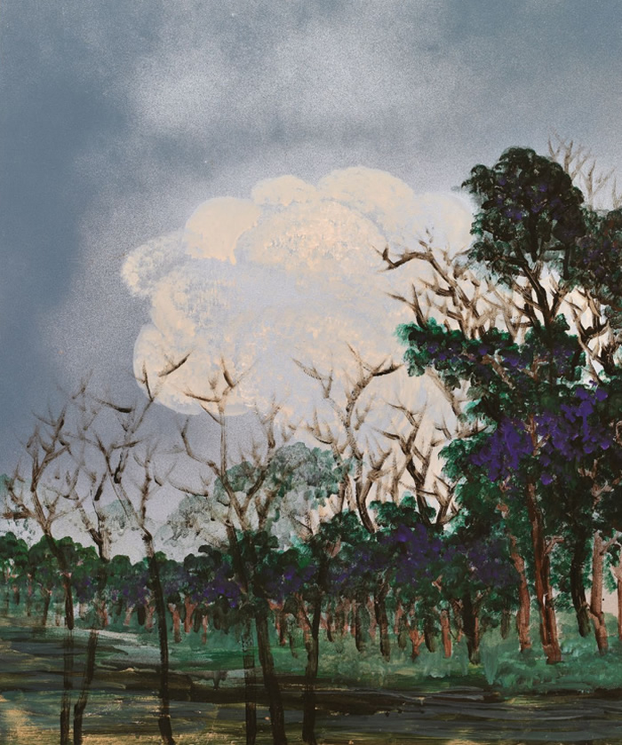 溫驤早期漆畫用筆多實,如山前的勁松遒勁挺拔,筆鋒清晰有力。近期創(chuàng)作的草木多用虛筆,借用漆液的粘稠,形成影影綽綽、筆筆粘連的效果,并不在意細節(jié)的工巧。新作的寫景用色拘無定法,或?qū)憣嵒蜈せ茫嬛卸嘤袧O樵耕讀的山水符號,但常被突至的現(xiàn)實或超現(xiàn)實元素所介入,呈現(xiàn)跳脫常規(guī)的景致。