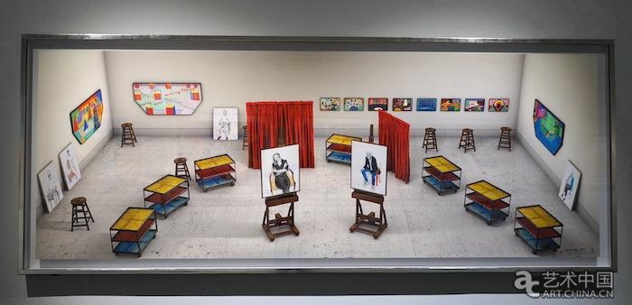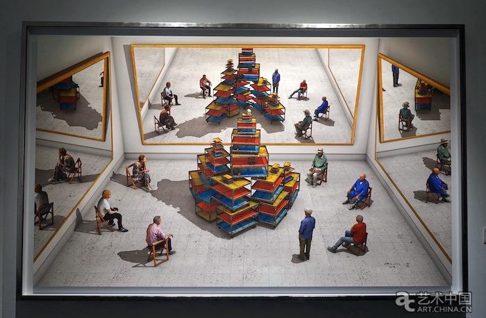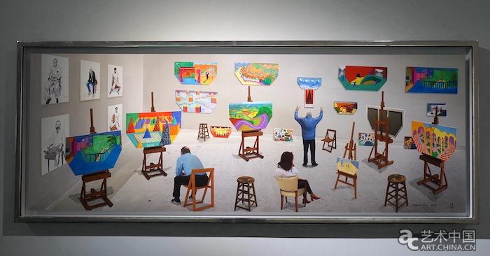 近十幾年來,霍克尼用數(shù)碼攝影的方式來描繪他的工作室,成為一種特殊的題材,他將這類作品稱為“攝影式繪畫”。在此畫室被按比例放大,其中包含了他的畫作,有時(shí)是對(duì)工作室本身的描繪,有時(shí)其中充斥著走動(dòng)、交流、欣賞作品的人們。他用多達(dá)200張數(shù)碼照片創(chuàng)建一張多視點(diǎn)圖像,使觀眾更容易進(jìn)入畫面的空間,接近主題。展出的作品《觀眾欣賞現(xiàn)成作品、骷髏和鏡子》中,霍克尼甚至在立方體空間中設(shè)置了三面鏡子,鏡子中反射出另一面鏡子中的場景,物體的視角、鏡面的視角各不相同,應(yīng)接不暇。