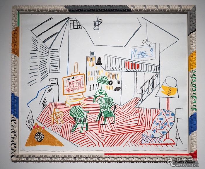 從倫敦到洛杉磯,霍克尼總在捕捉生活中的美好瞬間,用畫筆記錄對(duì)生活的深刻觀察和獨(dú)特理解。室內(nèi)的陳設(shè)、窗外的風(fēng)景、海邊的浪和大片的森林,在他筆下融入波普意味的玩趣,獨(dú)有的幽默氣息和自發(fā)實(shí)驗(yàn)?!恫ɡɡ分休p松愉快的線條,看似不經(jīng)意卻與圖像相呼應(yīng)的設(shè)色邊框,都充滿詩意和生命力。
