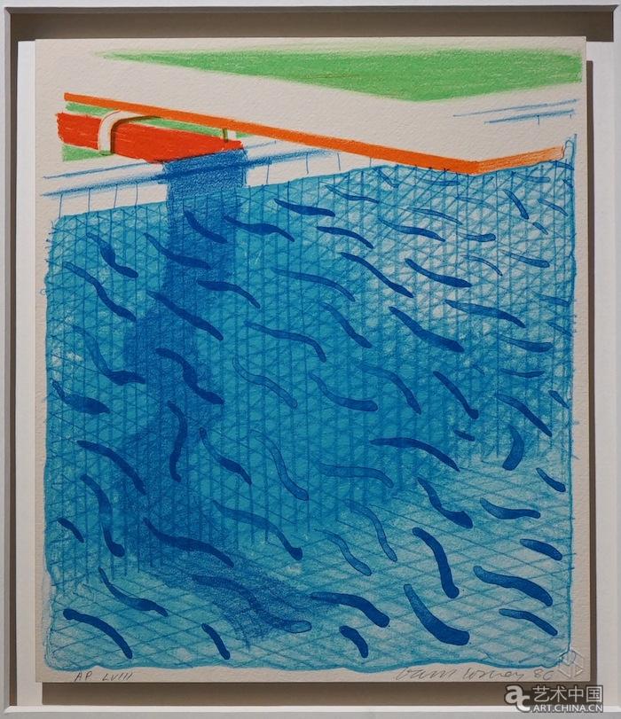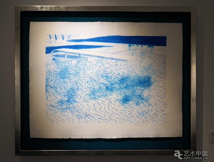 談起大衛(wèi)·霍克尼,首先想到的是他代表性創(chuàng)作之一《更大的水花》,以簡練線條和色塊描繪了典型加州夢圖景,濺起的水花筆觸精妙,在時(shí)空中定格。如同歷史上許多著名藝術(shù)家一樣,水是他永恒的主題之一,對(duì)水的觀察和研究一直進(jìn)行著?;艨四岵蹲剿槁湎?、漣漪形成、水花四起的瞬間,描繪水面光影的變化,表現(xiàn)水的透明和流動(dòng)、表面和深度。本次展覽也展出了《水池》《水波》兩幅作品,通過舞動(dòng)于水下的線條和光影,表現(xiàn)水的透明、深度和空間關(guān)系。然而,區(qū)別于對(duì)標(biāo)志性圖片的“偉大”仰視,《紙間漫行》更多展現(xiàn)了一個(gè)“多視角”、情感充沛、貼近生活的霍克尼。
