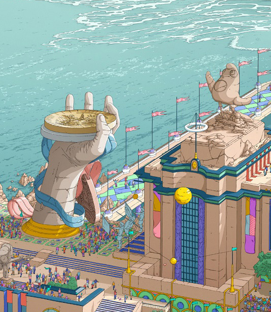 在今天設(shè)計和插畫領(lǐng)域被人工智能插畫和其他“高效生產(chǎn)”占據(jù)的背景下,烏戈?加托尼堅持用數(shù)碼筆手工完成。他說:“這需要時間。制作一幅精美的手繪作品很復(fù)雜。因此,我接受那些允許我花時間在藝術(shù)上,并尊重我的手藝的品牌的機(jī)構(gòu)合作,而且我不會在品牌合作中保留我的個人風(fēng)格。我很幸運能夠隨心所欲地繪畫。”