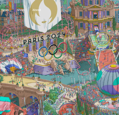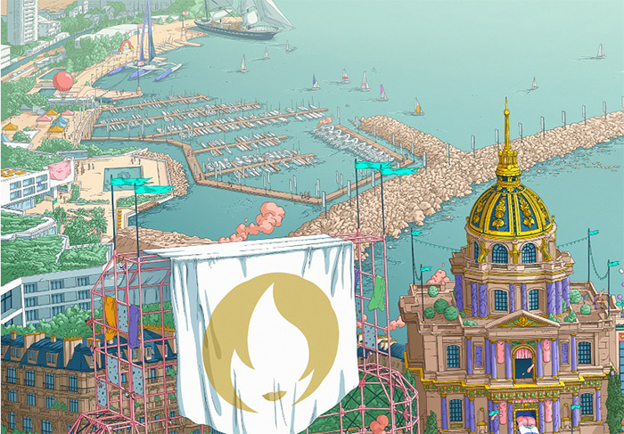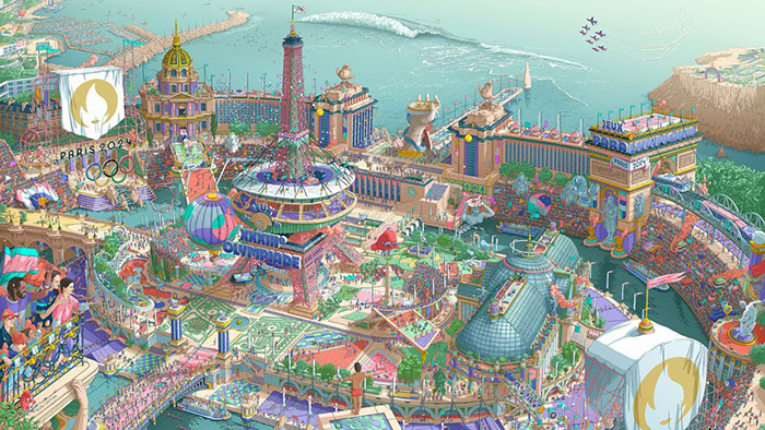烏戈?加托尼得到了巴黎奧運會設(shè)計總監(jiān) JOACHIM RONCIN的高度信任,擁有完全的創(chuàng)作自由。在遵循簡要說明并尊重奧運會外觀的同時,加托尼仍設(shè)法保持自己俏皮、愉悅的繪畫風(fēng)格。事實上,無論觀眾年齡多大都能從這幅藝術(shù)作品中得到一些樂趣。