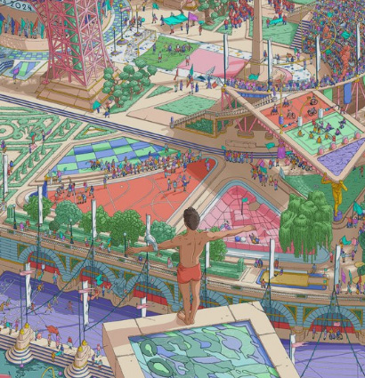在這幅2024巴黎奧運超現(xiàn)實主義的“清明上河圖”中,藝術(shù)家跨越古今時空,巧妙地將奧運體育元素拼貼融合在巴黎豐富的文化敘事中,為全世界觀眾呈現(xiàn)出了一個奇幻的巴黎奧運體育場圖景。