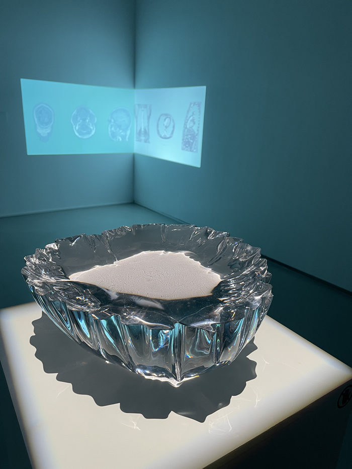 這里沒有福爾馬林和消毒水的味道,卻給人以冷峻的氣息;這里不是醫(yī)院或?qū)嶒炇遥瑓s在美術(shù)館的劇場敘事中建構(gòu)了一場他者的審視:血液、骨骼、內(nèi)臟、器官、身體中的水分和脂肪,甚至是時而閃現(xiàn)的基因密碼……它們以大理石、人造水晶、瑪瑙、樹脂、陶瓷、熒光等材料具象的呈現(xiàn)在觀者面前,這是藝術(shù)家對自身掃描后的物化再現(xiàn),但當(dāng)我們以同類的人類身份去觀看,亦難把自己的個體體驗摘除干凈——面對著這些自我身體中的存在,既親切又陌生。當(dāng)它們以這種形式靜置在眼前,竟一時難辨:這是對他者的旁觀,還是對自我的凝視?當(dāng)同樣的血肉、骨骼、體液都抽離出這具身體,每個人的身份與經(jīng)驗又是否相同或不同?