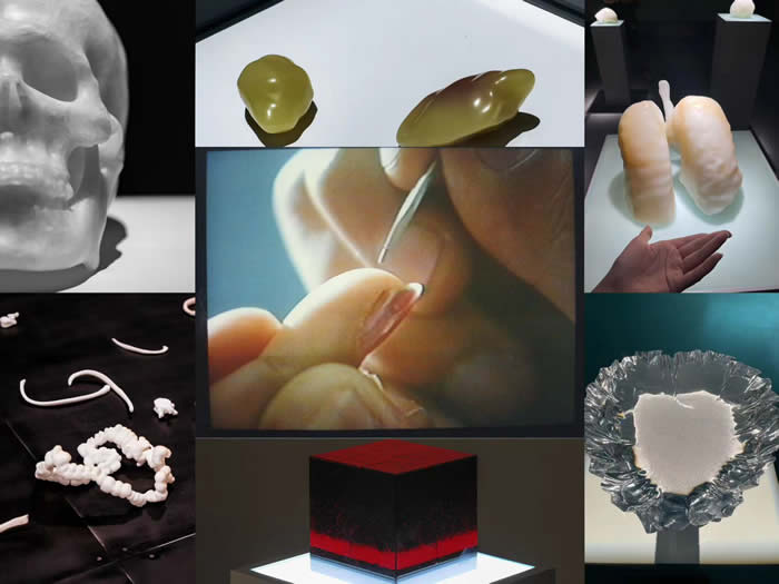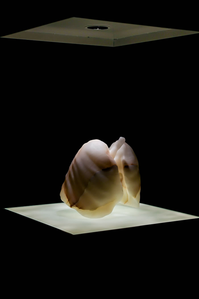 和《器官與骨頭》密切聯(lián)系的“內(nèi)臟”系列組成的陣列位于展覽末尾。用白色瑪瑙制作的心臟、肺、大腦、肝臟被陳列在柱形展臺上,隨著漸變光和射燈而時明時暗,射光下的白色瑪瑙給人以儀式和神圣感。