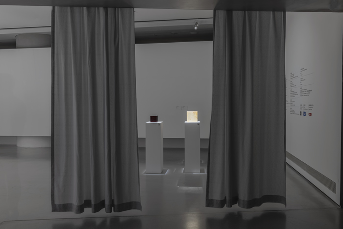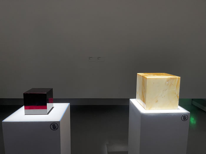 就如同回應(yīng)著展覽伊始那件《我的身體的水的總量》一樣,在展覽尾聲,并置著《血液總量》和《脂肪總量》兩件作品。在身體中流淌無形的它們此刻被固著為精準(zhǔn)完美的立方體——分別是13立方厘米和21立方厘米,就如同其他作品一樣,散發(fā)著藝術(shù)家本人的理性、嚴(yán)謹(jǐn)和克制。而縱觀整個展覽,這樣的形狀不禁讓人想到卷軸字畫落款處的名章,至此,展覽結(jié)束。