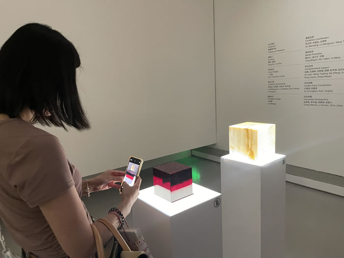 那是一種很微妙的感受。開始的時候,人們更多會對這些臟器的形狀和大小而驚訝:“誒,肝臟有這么大嗎?”“這個腦子和樓下的頭骨是一起的嗎?感覺更大一些……能裝進(jìn)去嗎…”當(dāng)表層的視覺好奇得到解答后,觀眾卻并沒有選擇走開,而開始一圈圈的巡視或者隔開一段距離的觀望——這個過程,是沉默的。當(dāng)我們看向那靜止的石頭,它既熟悉又陌生,雖靜態(tài)卻又仿佛隨著燈光起伏,它的材質(zhì)本應(yīng)該冰冷,但它在身體中卻是溫?zé)岬摹?.在這漫長的沉默與對望中,觀者抽離著自己又將自身反現(xiàn)于眼前。