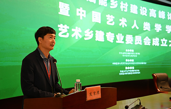此外,南京傳媒學(xué)院副校長陳小波主持了主旨發(fā)言環(huán)節(jié),四川大學(xué)藝術(shù)學(xué)院學(xué)術(shù)院長黃宗賢圍繞藝術(shù)鄉(xiāng)建為何、藝術(shù)鄉(xiāng)建何能、藝術(shù)鄉(xiāng)建何為展開發(fā)言,他認(rèn)為越來越多的藝術(shù)家關(guān)注藝術(shù)鄉(xiāng)建、投入到藝術(shù)鄉(xiāng)建中,背后是歷史邏輯、實(shí)踐邏輯和現(xiàn)實(shí)的需求。黃宗賢教授還指出藝術(shù)鄉(xiāng)建絕對不是藝術(shù)的事實(shí),更不是藝術(shù)的空間回憶。藝術(shù)鄉(xiāng)建是生態(tài)體系的重構(gòu)與再造,是人與生活實(shí)踐關(guān)系的重構(gòu),是一個(gè)系統(tǒng)化的體系建構(gòu)。對于如何把握藝術(shù)鄉(xiāng)建的維度,在黃宗賢教授看來,要避免同質(zhì)化的問題,應(yīng)當(dāng)考慮到中國人基于農(nóng)耕文明而形成的生活方式,而不是一廂情愿的植入藝術(shù)家的理念,應(yīng)當(dāng)充分尊重鄉(xiāng)民的主體性。最后他表示藝術(shù)鄉(xiāng)建專業(yè)委員會(huì)的成立必將推進(jìn)藝術(shù)鄉(xiāng)建的理論研究和實(shí)踐發(fā)展。