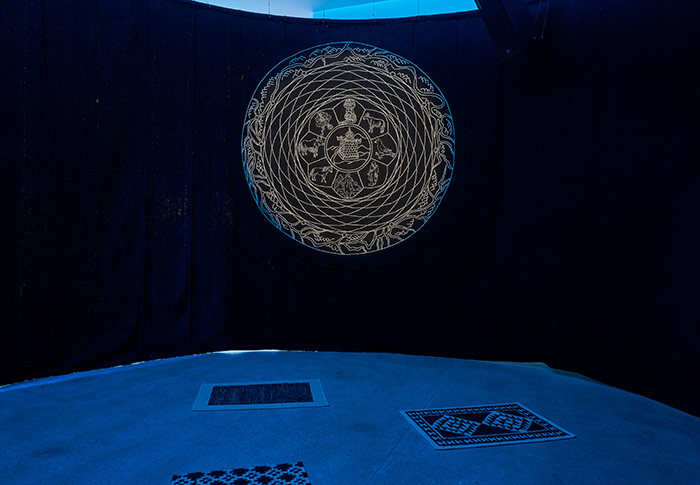 《動物悲歌》是“水系計劃”其中一個作品,在空行母的一份口述文本中,通過1000次轉(zhuǎn)世輪回,以動物的視角探索與人類的關(guān)系,講述人感知動物的一種智慧。當?shù)鼐用駥τ谒竦某绨菀约凹榉柡蛿?shù)字在藏族文化中的應(yīng)用,顯示出人類通過對自然的尊重和依賴構(gòu)建出一種和諧的生活方式,強調(diào)了人與自然的緊密聯(lián)系及其共生共榮的重要性。