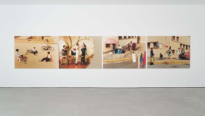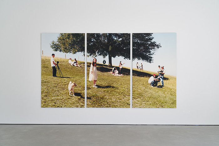 在為此次展覽創(chuàng)作的最新作品中,馬海倫突破了大眾對新疆傳統(tǒng)文化的固有印象,將鏡頭轉(zhuǎn)向未曾被關(guān)注的當代中產(chǎn)家庭生活場景。她受到三聯(lián)畫敘事風(fēng)格的啟發(fā),記錄了一次“夏日野餐”的尋常瞬間。通過精心設(shè)計的場景和人物互動,日常生活與虛構(gòu)敘事的融合營造出一種偽紀實感,也為觀眾帶來了觀看新疆的另一種視角。