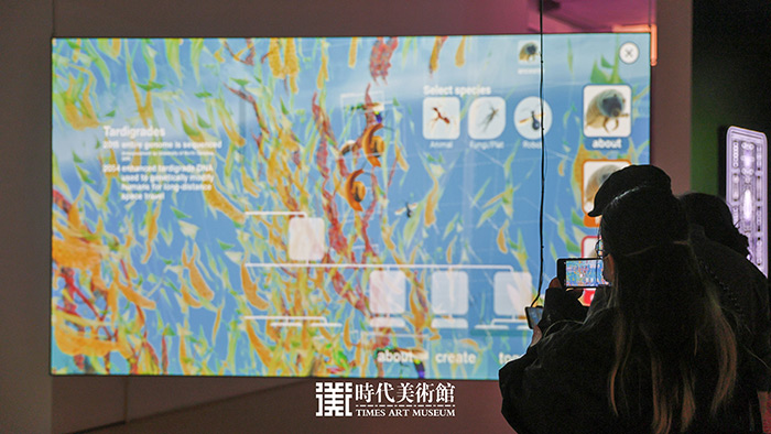 你也可以隨時(shí)拿起手機(jī)與作品互動(dòng):瑞士藝術(shù)家馬克·李的《演化推測(cè),原型 1》通過(guò)移動(dòng)應(yīng)用程序與網(wǎng)絡(luò)裝置的結(jié)合,邀請(qǐng)觀眾創(chuàng)造新的生物變種,體驗(yàn)與工程改造物種共存的生態(tài)系統(tǒng),引發(fā)我們對(duì)未來(lái)生物多樣性的深思。藝術(shù)家在開幕式的發(fā)言中表示:“在科技進(jìn)步的今天,我們應(yīng)以更謙遜的態(tài)度對(duì)待自然,實(shí)現(xiàn)人與自然的和諧共生”。