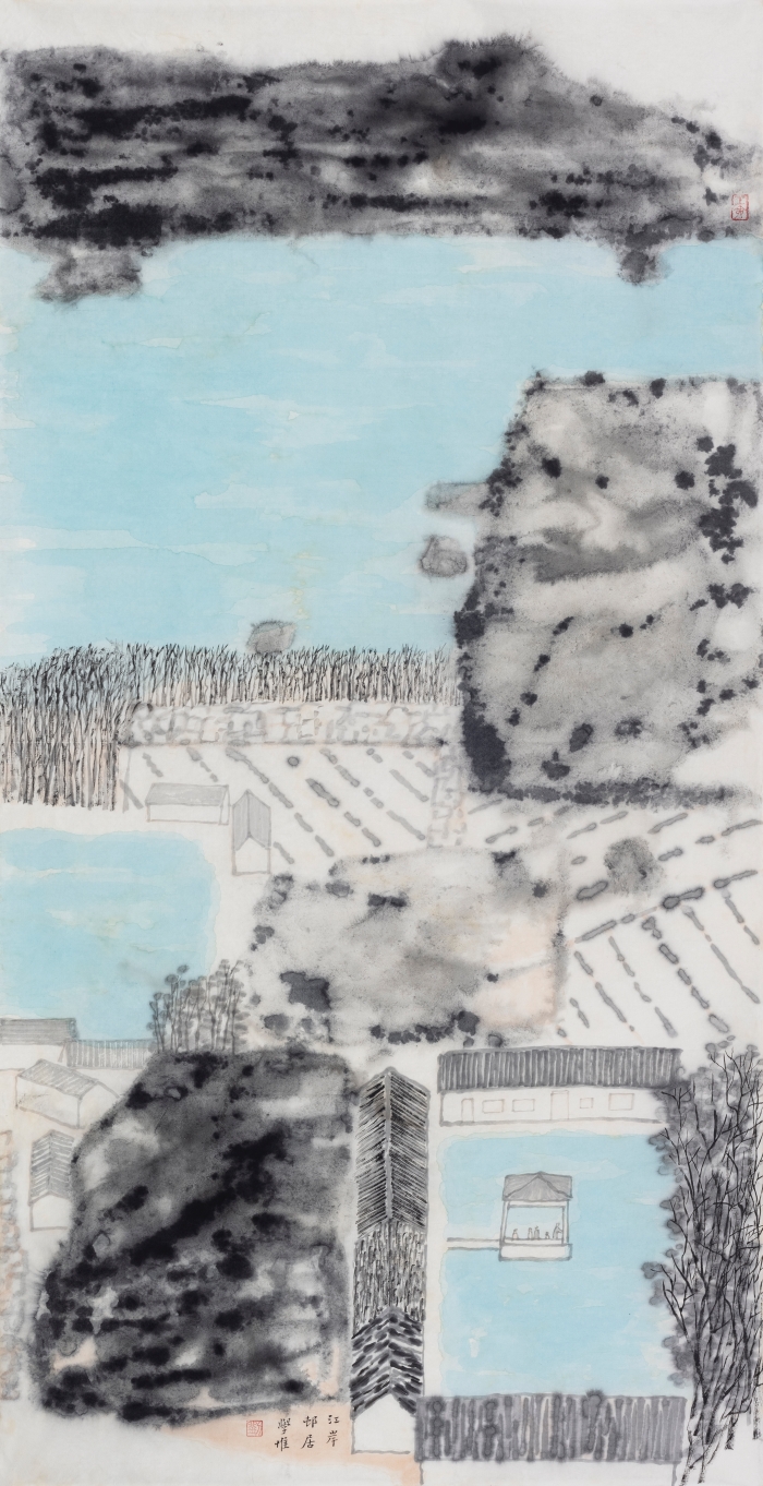 劉學(xué)惟《江岸邨居》68x136cm 紙本水墨設(shè)色 2022年