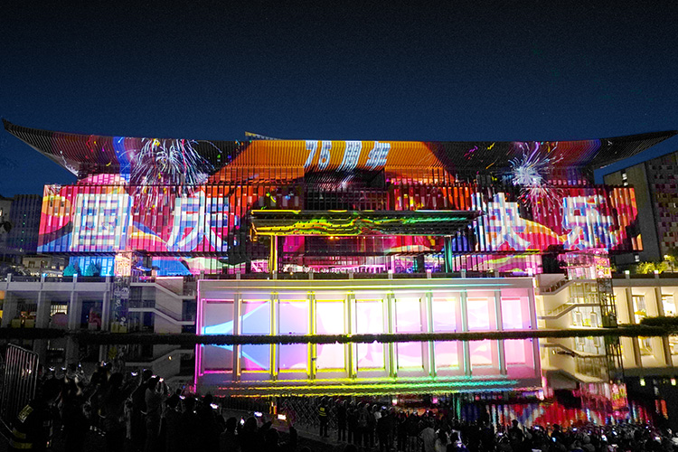 《一抹紅 向上游》是主創(chuàng)團隊為獻禮國慶75周年特別創(chuàng)作。當中央廣場音樂響起,紅綢飛舞,紅旗飄動,見東方巨龍升空;飛躍山河,“復興”號動車組貼地飛馳而過;躍入太空,與“神舟”號空間載人飛船于“天宮”中國空間站一同相會……最后,巨龍化作綻放的花朵,焰火燃放于繁華星空,同慶祖國華誕。