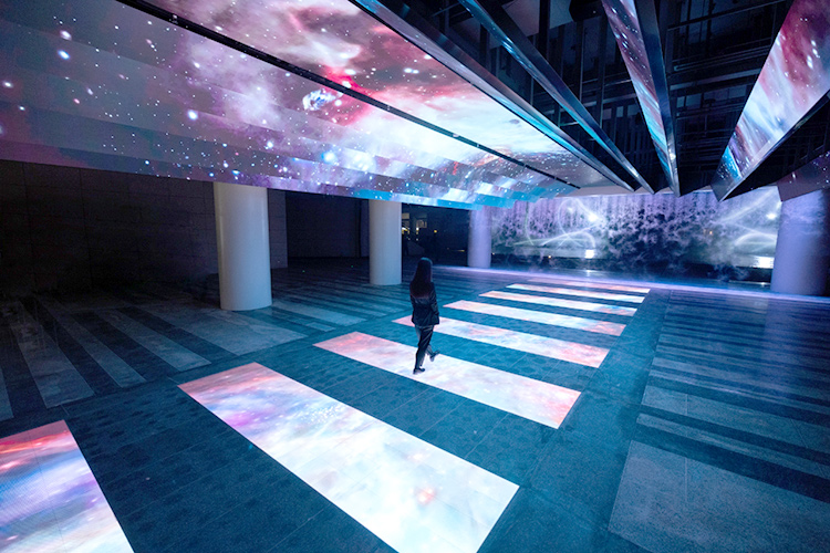 這是一個由20組LED影像構(gòu)建而成的數(shù)字空間,包含11組天空屏和9組地面屏,形成光影交錯、沉浸無邊的“藝術(shù)光廳”。