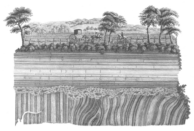 埃爾丁的約翰·克拉克的著名版畫作品《蘇格蘭杰德堡的赫頓地層不整合》。經(jīng)佩尼庫克(Penicuik)的羅伯特·克拉克爵士(Sir Robert Clerk)許可轉載。