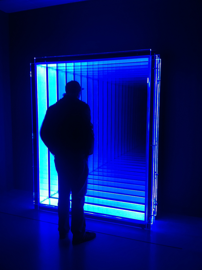 現(xiàn)在巴爾的摩生活工作的藝術家安哲鉉也運用重復的手法來想象無限的循環(huán)。他的作品《虛空》由鏡子和燈光等簡單的日常材料構成。安的作品讓人聯(lián)想到丹·弗拉文和唐納德·賈德等極簡主義者的作品,他們結合使用普通的日常材料來創(chuàng)造體驗空間。在作品《虛空》中,觀眾站在這件高 7英尺、寬 6英尺的作品前,鏡子中的光反射會產生重復的反射效果,讓觀看者感覺自己面對著無限遠,而自己的倒影則處于中心位置。盡管安出生于韓國,但他的藝術訓練主要是來自西方的。對其作品更加寬泛的解釋可能包括佛教哲學的“空性”,尋求事物和事件的真實本質,或者正如佛教作家和導師劉易斯·里士滿所說的那樣,空性意味著“事物并不像我們所執(zhí)著的自我所假設的那般存在著”。在這次展覽的背景下對安的作品的這種闡釋開啟了文化、宗教與科學觀念之間看似和諧的關系之間的比較。