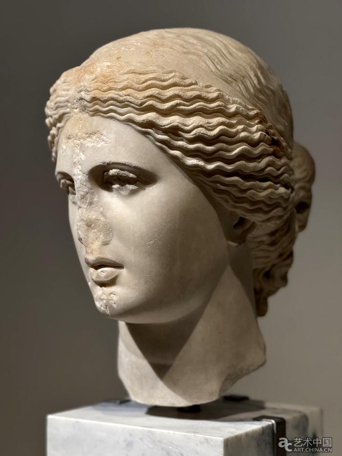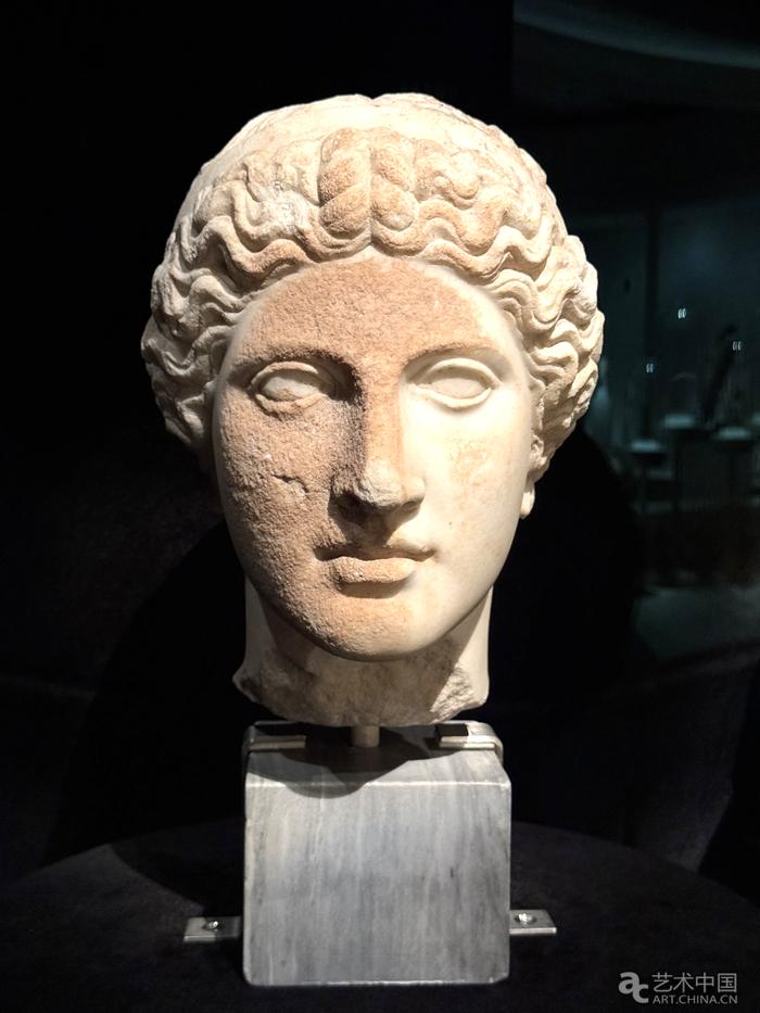 大理石阿佛洛狄忒頭像,來自雅典的古羅馬市集。公元前4世紀(jì)原作的羅馬復(fù)制品。它復(fù)制了著名古典雕塑家普拉克西特列斯的原作。原作的模特是藝術(shù)家的伴侶、著名“交際花”芙里尼。頭像的額頭在基督教時(shí)代被刻上了十字架。