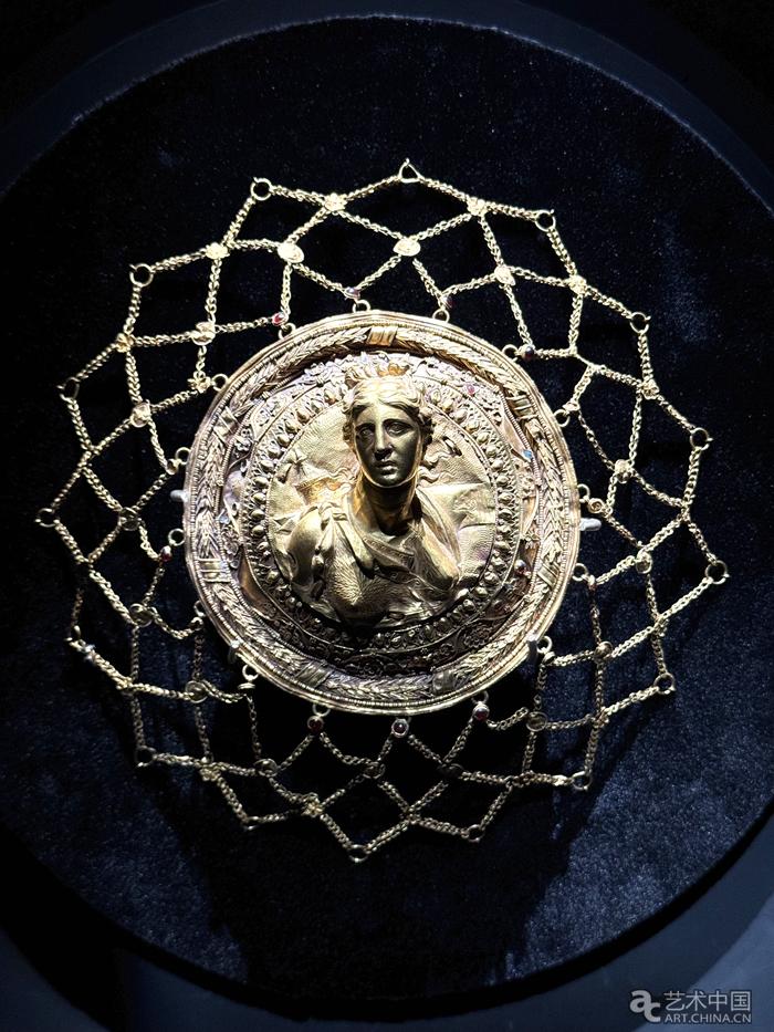 阿爾忒彌斯金鏈網(wǎng)頭飾,公元前4—前3世紀(jì)。這件頭飾精致的鏈網(wǎng)鑲嵌有紅寶石和藍(lán)琺瑯。中央的圓形裝飾展示了右肩負(fù)著箭筒的女神阿爾忒彌斯。