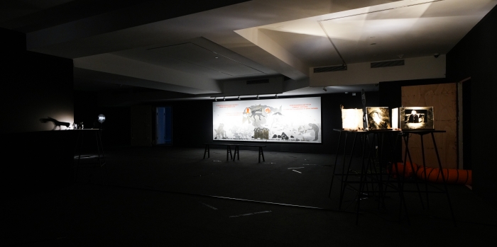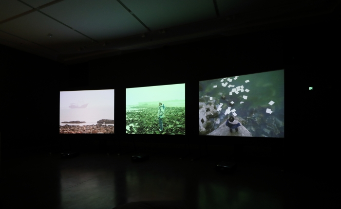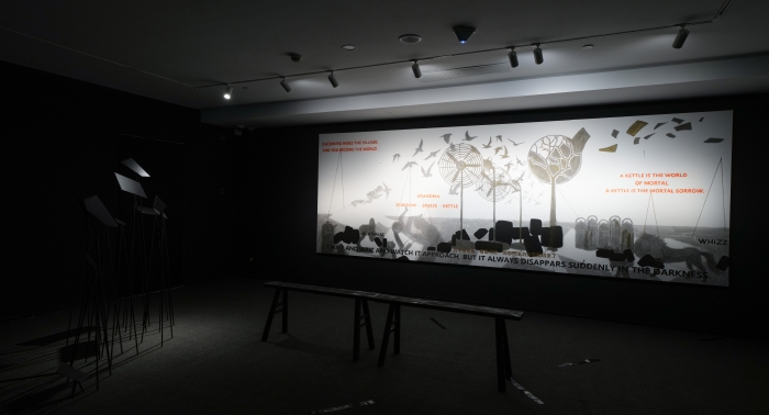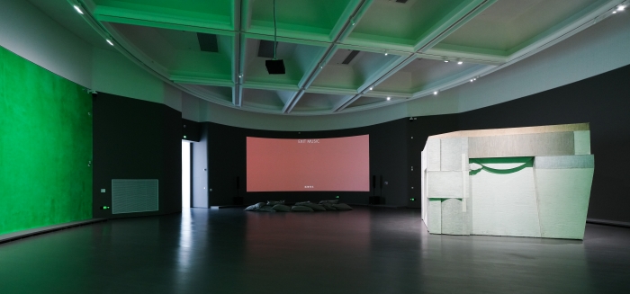在中國美術學院美術館外,由伊斯坦布爾本土藝術家切夫德特·埃雷克(Cevdet Erek)設計的舞臺《兩棲》將觀眾迎入一個相遇的空間,這個舞臺根據(jù)威尼斯雙年展行進路線上的不同地點進行塑造和調(diào)整。展廳內(nèi)匯聚了活躍于中國當代藝術體系中的藝術家們和創(chuàng)作集體:曹澍、陳量、程然、戴陳連、馮冰伊、高世強+山水集體創(chuàng)作、許江、康凱雯、劉韡、劉毅、邱志杰、石冰+林儀、楊福東、葉御風、易連、應歆珣、袁可如(按姓氏首字母排序)以及中國美術學院電影學院創(chuàng)作團隊、中國美術學院動畫與游戲?qū)W院創(chuàng)作團隊。展出許江的銅鑄雕塑《共生會否可能?》,邱志杰的紙上水墨《大閘蟹:藝術生態(tài)地圖》,高世強與山水集體創(chuàng)作的影像作品《山水:云山六章》,劉韡的裝置《看,書!》,楊福東的黑白膠片影像《陌生天堂》,易連的攝影《離散大陸》《一條街的敘事》,袁可如的影像裝置《永恒與片刻》,曹澍的影像裝置作品《妖糖》等等。