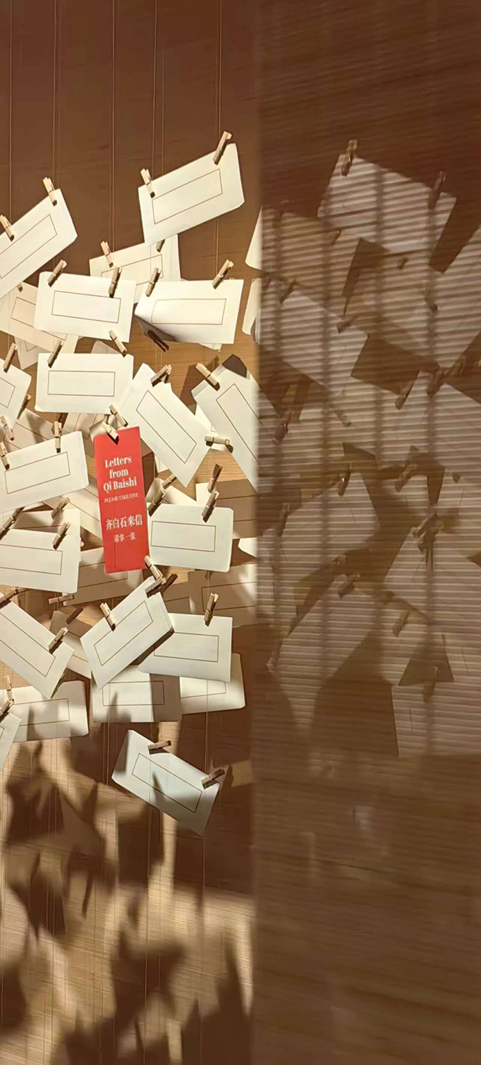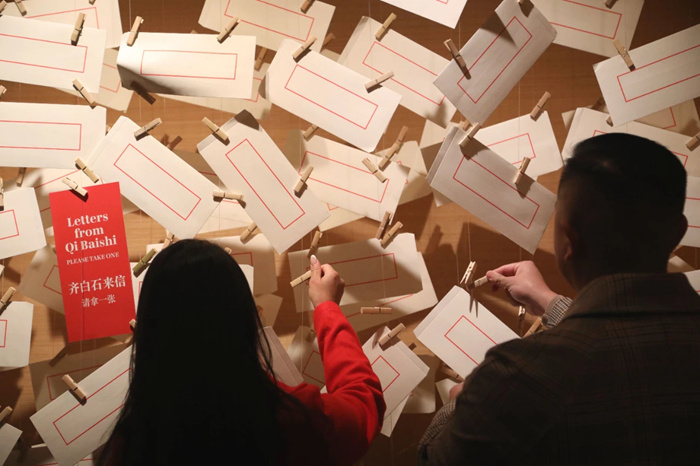 臨走前,觀眾可以從這里隨機(jī)抽取一張信封作為留念。此外,展覽還提供了精美箋紙和投稿箱,觀眾可以寫一封回信,與“白石老人”分享自己的觀展感受。