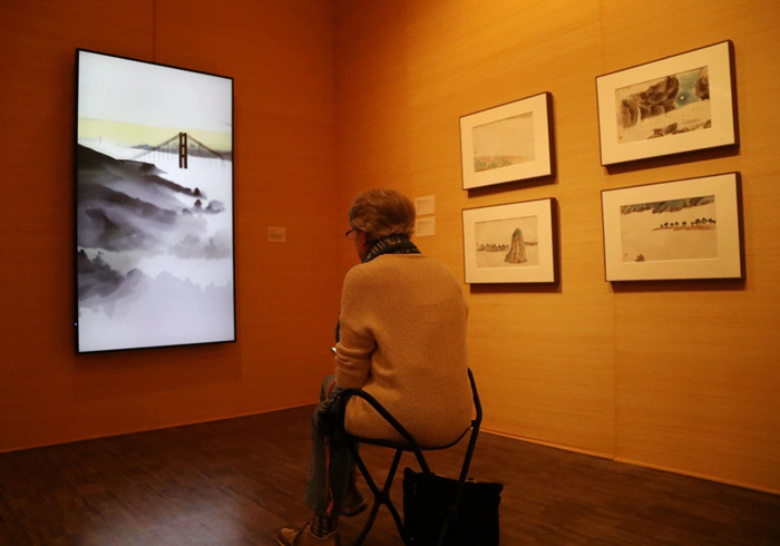 數(shù)字影像涵蓋三個單元,包含“寫生與寫意——從真實(shí)物像到藝術(shù)表達(dá)”,以魚的圖像為例展現(xiàn)東西方繪畫中對真實(shí)對象的不同表現(xiàn)手法;“筆墨分析”,從齊白石繪畫中的“一筆”為伊始,解析中國畫的水墨在宣紙上舞動力量;“師古人與我有我法”則呈現(xiàn)了計(jì)算機(jī)模型通過學(xué)習(xí)齊白石作畫風(fēng)格,結(jié)合AI輔助設(shè)計(jì)生成的“AI齊白石”圖繪舊金山的影像。
