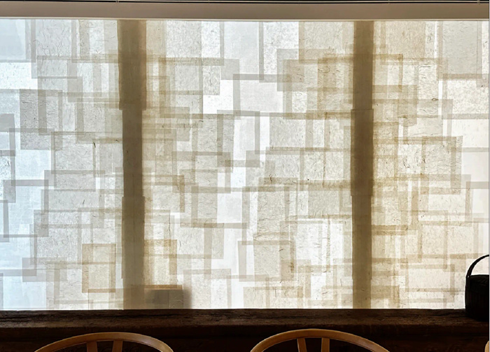 步入展廳,觀眾將置身于竹簾、宣紙共同構(gòu)成的藝術(shù)世界。這些從空中垂落的竹簾,半隱半顯,仿佛是胡同巷子里永遠(yuǎn)半敞著的矮門。它們分割了空間,展現(xiàn)出一進(jìn)一落的胡同結(jié)構(gòu);傳遞出鄰里之間親密的共生關(guān)系。墻面上的宣紙布景,由近十種不同的紙料構(gòu)成如構(gòu)樹皮、桑樹皮、云龍宣紙等構(gòu)成。紙面精細(xì)的紋理,起伏的纖維結(jié)構(gòu),帶領(lǐng)觀眾步入畫家的水墨人生。