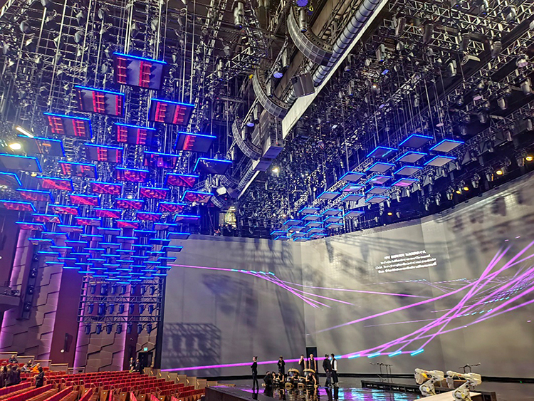 “面條幕”的設(shè)計同樣代表著一項重要的技術(shù)突破?!懊栏呙穭≡何枧_高度較大,常規(guī)幕布需要達到11米的高度,這勢必會對前排觀眾造成視覺壓迫?!被谶@一考慮,執(zhí)行總導演何璐璐提出了創(chuàng)新性的“面條幕”概念。趙曉宇進一步解釋道:“經(jīng)過系統(tǒng)論證,我們采用了精確的分割設(shè)計——將傳統(tǒng)幕布改造為寬度為0.3米、間隔0.01米的條狀結(jié)構(gòu)。這1厘米的間距是通過嚴密計算確定的,既確保了升降軸承的順暢運行,又完美保持了整體視覺效果?!?/p>