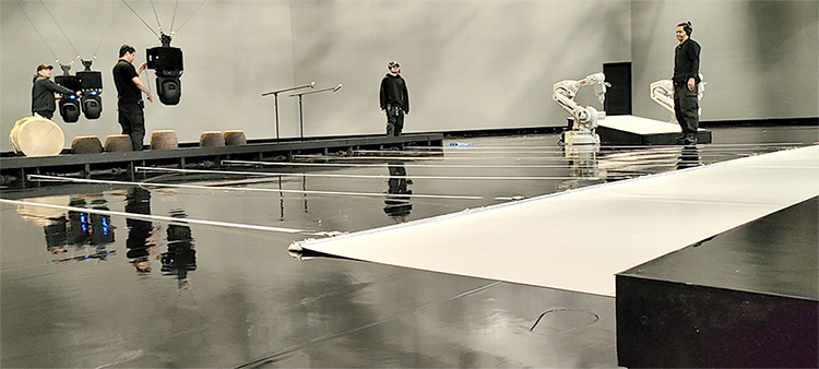 在整個創(chuàng)作過程中,張藝謀導演始終保持著對藝術(shù)細節(jié)的極致追求。趙曉宇舉例說明:“在‘神鼓·影子’單元中,我們最初為8米寬的投影幕選用的是常規(guī)材料。但效果呈現(xiàn)后感覺畫面表現(xiàn)力不夠理想。為了解決這個問題,我們和天津舞美研究所工程師經(jīng)過七八種不同材質(zhì)的反復測試,最終選定了一種特殊的柔性材料,才完美實現(xiàn)了導演預期的藝術(shù)效果?!?/p>