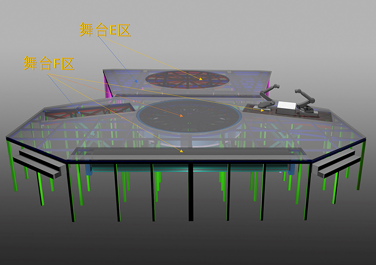 “這臺演出,機械裝置的設(shè)計核心在于實現(xiàn)雙重目標:完美的功能性和絕對的隱蔽性?!壁w曉宇強調(diào)道,“以E區(qū)升降臺為例,在靜態(tài)時必須與舞臺完美融為一體,而在演出時又能穩(wěn)定承載演員表演。同樣,F(xiàn)區(qū)的車臺系統(tǒng)在待機狀態(tài)下與舞臺表面嚴絲合縫,啟用時則能執(zhí)行精準的多維度動作。這些技術(shù)要求都需要達到極高的工程精度標準。”