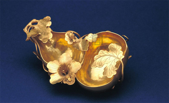 這件清代中晚期時(shí)的陳設(shè)用品八成金質(zhì),為剖開(kāi)的半個(gè)葫蘆。器身外有葫蘆藤葉纏繞,并有盛開(kāi)的花朵,花瓣上有昆蟲(chóng)趴臥。做工極其精致而富有巧思,一洗金器的霸氣張揚(yáng),呈現(xiàn)出婉約俏麗的姿態(tài)。