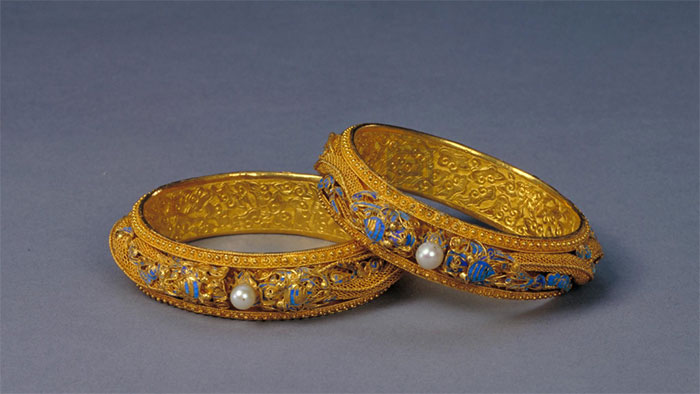 明清時(shí)期,制金技藝在繼承提煉此前數(shù)代工藝的基礎(chǔ)上繼續(xù)向前發(fā)展,達(dá)到新的高峰,至清代時(shí)掐絲琺瑯、點(diǎn)翠等技法廣泛應(yīng)用,宮廷黃金制品尤為精美。