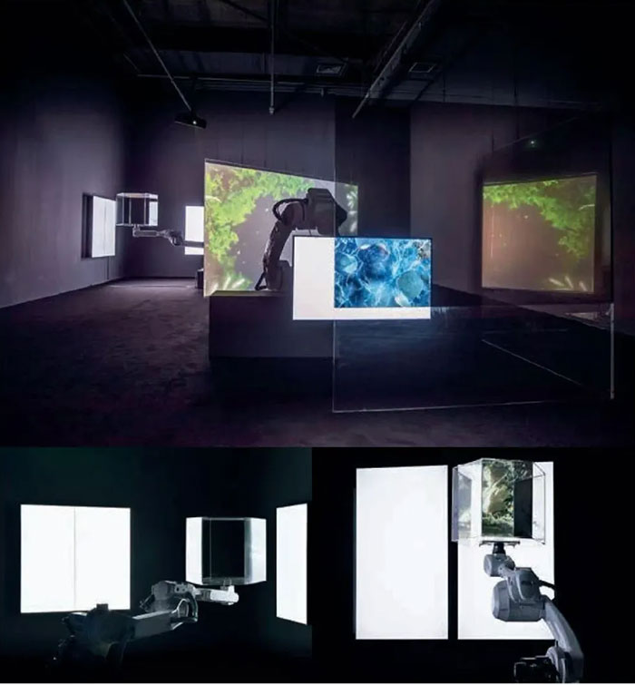 同樣是2024年,在上海舉辦的第14屆全面美展,人工智能在藝術作品中的運用成為本屆官方展覽的一大特征。例如,陳抱陽的《智能體共生:從運河到銀河》通過利用人工智能多智能體系統(tǒng)控制機械臂和光學裝置來模擬一個復雜的生態(tài)系統(tǒng);譚彬等人的《世界投影:文明的互鑒》運用AI技術,將不同文明的影像進行蒙太奇式的重新組合和演繹;袁藝湲等人的《大腦花園·超元》結合AI和虛擬技術,探索人類生存危機、文化異化等主題。