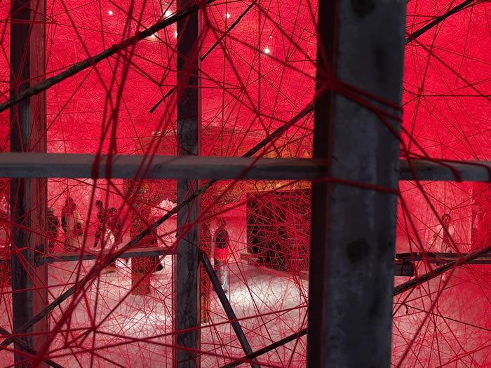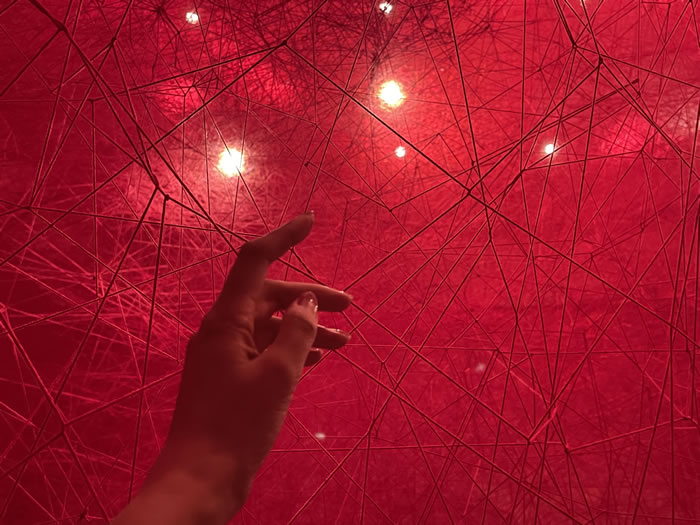 紅色線繩如同毛細(xì)血管一樣交織成一片海,在燈光下彌散出紅色的氤氳光芒(拍攝:傅朗)