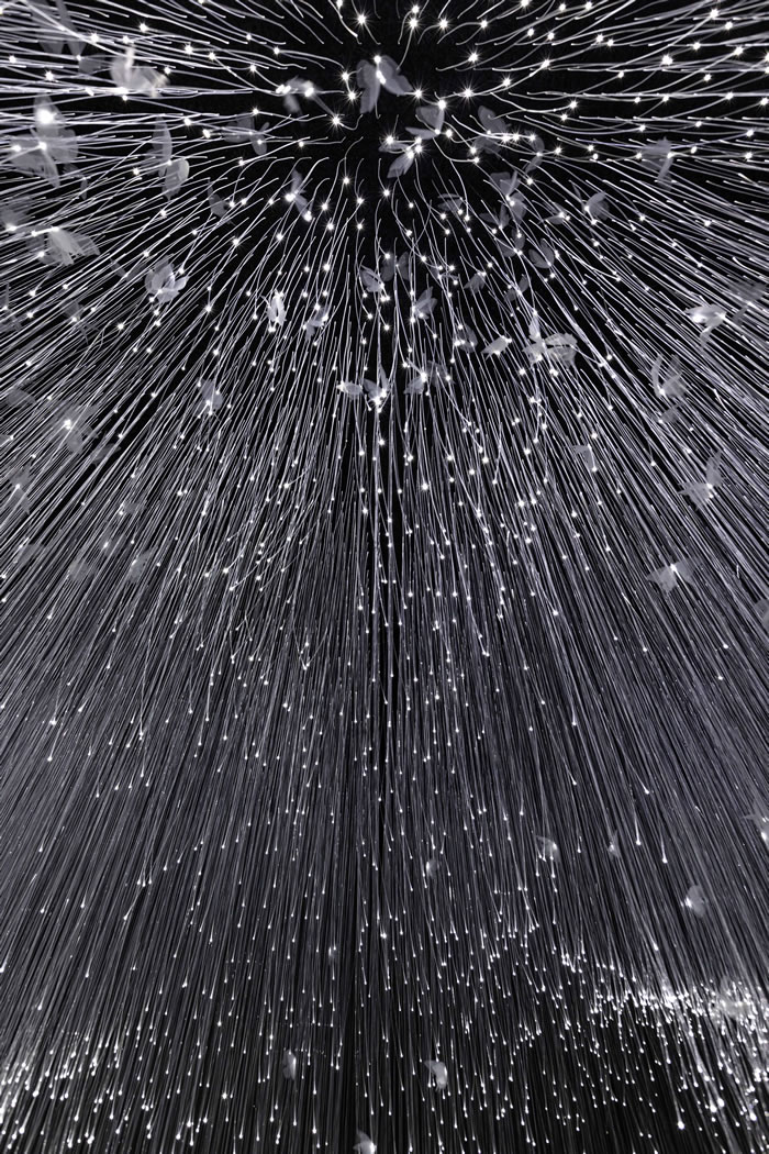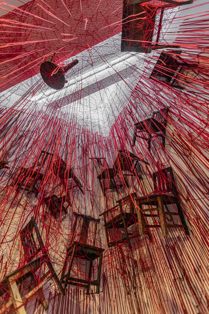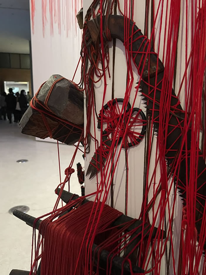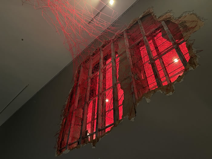 鹽田千春的紅繩,如同人體內(nèi)的一條條毛細(xì)血管,蔓延交錯(cuò),細(xì)密著將整個(gè)展廳染出一片紅光。當(dāng)這些紅繩纏繞著奪墻而出時(shí),又像極了人性本身——伸張向渴望的宇宙,全力沖破邊界又在這一過程中彼此交織而束縛。