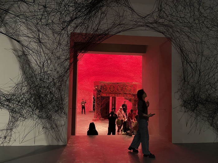 《通往靜寂之門》以藏傳佛教古建門庭為核心,數(shù)萬根紅線刺穿墻體延伸天際,形成物理空間與精神維度的雙重突破。當(dāng)觀者穿越這座"門庭"時(shí),傳統(tǒng)古建的構(gòu)件與當(dāng)代裝置語言碰撞出東方"空"的時(shí)空觀——存在即是在穿透與彌合中永恒流動(dòng)。本次展覽策展人閆士杰認(rèn)為:“鹽田千春的紅線在此是依緣而顯、隨緣應(yīng)物的當(dāng)下覺知?!倍@件作品也邀請(qǐng)觀者進(jìn)入一個(gè)沉思與悟化的空間,凝視與自渡。
