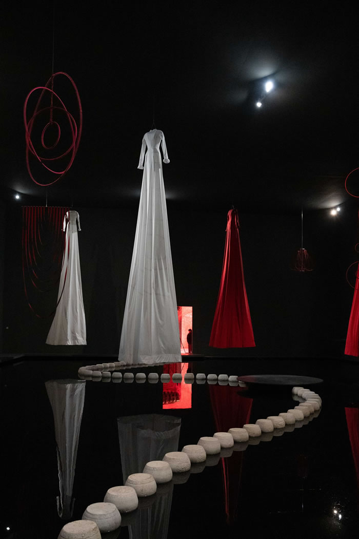 作品《多重現(xiàn)實(shí)》營造出極具張力的“劇場感”。在昏暗的展廳里,七件巨大而空蕩的衣裙緩緩旋轉(zhuǎn),倒映在平靜而漆黑的水面上。在此,藝術(shù)家以空蕩的連衣裙為載體,既是對(duì)“第二層皮膚”的隱喻,亦是 對(duì)“肉身消逝后靈魂起舞”的追問——肉身雖消失,但仍能從裙擺的運(yùn)動(dòng)中感受到其曾經(jīng)的存在。藝術(shù)家坦言:“衣服承載個(gè)體的記憶、情感與經(jīng)歷,是自我的延伸?!薄笆挛锏娜毕⒎窍?,而是融入更遼闊的宇宙,重新參與時(shí)間的流轉(zhuǎn),與萬物相連?!备╊_下,水面上一條蜿蜒的石墩小徑連通著兩個(gè)獨(dú)立的空間,一端經(jīng)過黑暗的甬道通向柔光充盈的《意識(shí)的蛻變》,另一端則恍惚間暈染出一片紅色繩海,仿佛施了魔咒一樣“引誘”觀眾“通往靜寂之門”。