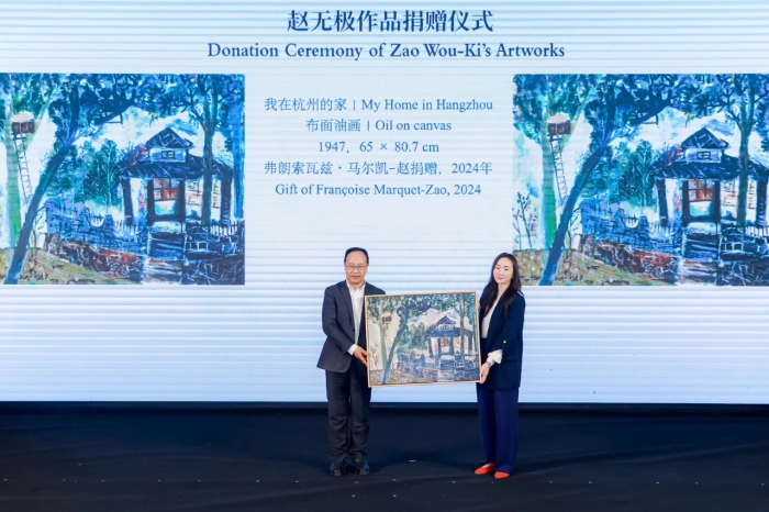 由于展覽的成功舉辦,趙無(wú)極夫人、趙無(wú)極基金會(huì)主席弗朗索瓦茲·馬爾凱-趙女士(Fran?oise Marquet-Zao)決定向中國(guó)美術(shù)學(xué)院美術(shù)館捐贈(zèng)系列趙無(wú)極作品。2024年10月15日,弗朗索瓦茲·馬爾凱-趙女士、趙無(wú)極基金會(huì)藝術(shù)總監(jiān)揚(yáng)·亨德根(Yann Hendgen)分別與中國(guó)美術(shù)學(xué)院美術(shù)館館長(zhǎng)、“大道無(wú)極——趙無(wú)極百年回顧特展”策展人余旭紅共同簽署了趙無(wú)極作品捐贈(zèng)協(xié)議、共建趙無(wú)極研究中心備忘錄。弗朗索瓦茲·馬爾凱-趙女士此次捐贈(zèng)包括趙無(wú)極油畫作品10件、版畫174件(包括版畫插圖書15套)、瓷繪作品28件,共計(jì)212件作品。油畫捐贈(zèng)作品中包括《無(wú)題(靜物)》(1935)、《我在杭州的家》(1947)、《無(wú)題(寺廟和墳?zāi)梗罚?947)、《05.10.50 -紀(jì)念我的妹妹無(wú)華》(1950)等趙無(wú)極早年作品,畫面內(nèi)容涵蓋靜物、風(fēng)景、人物等,體現(xiàn)了趙無(wú)極與杭州的獨(dú)特關(guān)聯(lián)?!稛o(wú)題(靜物)》是趙無(wú)極存世最早的一幅油畫作品,反映了趙無(wú)極就讀于國(guó)立杭州藝術(shù)??茖W(xué)校(現(xiàn)中國(guó)美術(shù)學(xué)院)時(shí)對(duì)油畫技法的最初探索與實(shí)踐。