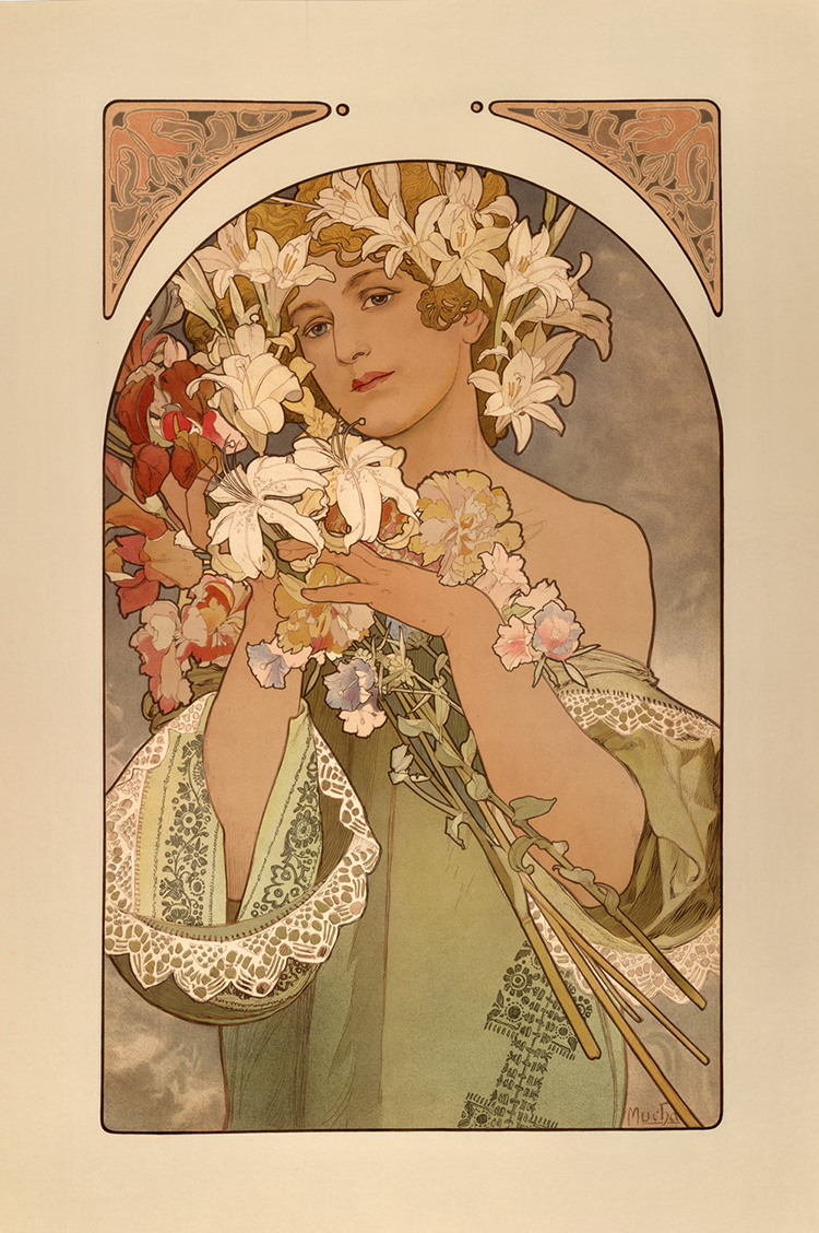 阿爾豐斯·穆夏(Alphonse Mucha,1860-1939)出生于摩拉維亞(現(xiàn)捷克東部地區(qū))南部的小鎮(zhèn)伊萬(wàn)契采,少年時(shí)期即展露繪畫(huà)天賦,曾在維也納做過(guò)劇場(chǎng)舞臺(tái)布景學(xué)徒,后赴慕尼黑、巴黎求學(xué),繼而定居巴黎以求發(fā)展。1894年為法國(guó)傳奇女演員莎拉·伯恩哈特設(shè)計(jì)戲劇海報(bào)《吉斯蒙達(dá)》一舉成名,開(kāi)創(chuàng)新藝術(shù)運(yùn)動(dòng)的標(biāo)志性風(fēng)格“穆夏風(fēng)格”。
