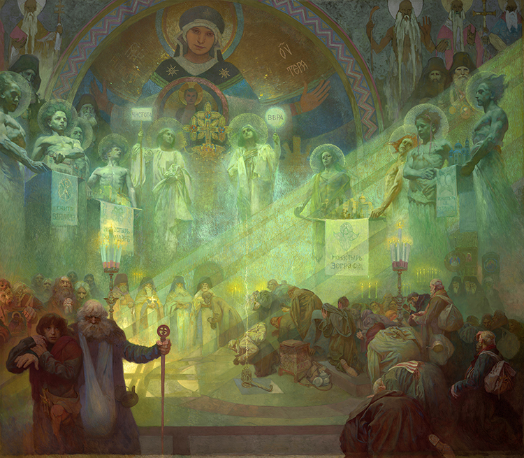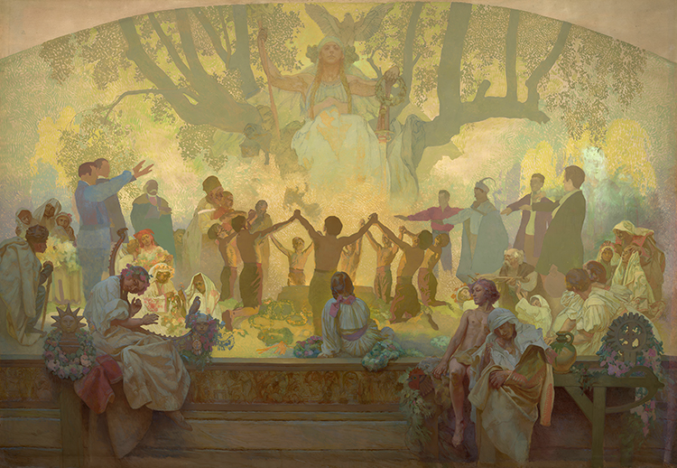 穆夏雖身在巴黎,但一直心系故國(guó),最終于1910年攜妻兒回到捷克,定居布拉格,開(kāi)始專(zhuān)注于巨幅系列油畫(huà)《斯拉夫史詩(shī)》的創(chuàng)作,期間幾乎不再接受任何商業(yè)訂單,轉(zhuǎn)而熱衷于公益創(chuàng)作,致力于捷克文化和慈善項(xiàng)目的推廣。